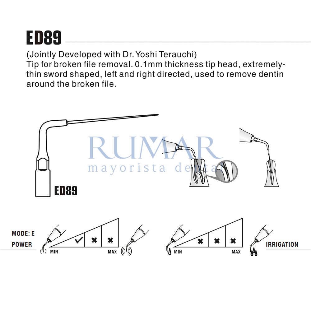 ED89 or Katana-H, designed in cooperation with Dr. Yoshi Terauchi, for the removal of broken files in combination with the other tips in the BFRT Endo Kit (ED87, ED88 and ED89). With an extremely fine sword-shaped tip, it can be pre-curved according to the degree of curvature of the root canal.