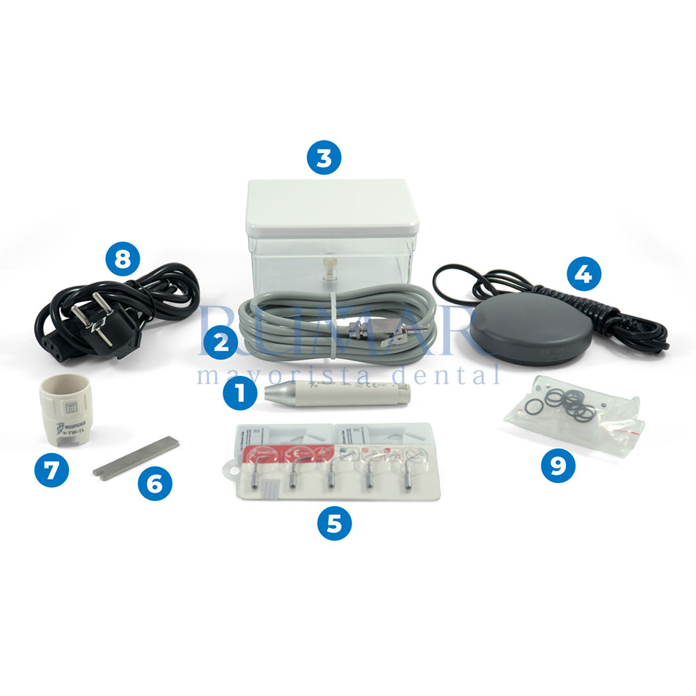 - Incluye: 7 puntas, llave autolimitante, llave endo. pieza de mano, pedal y repuestos varios.